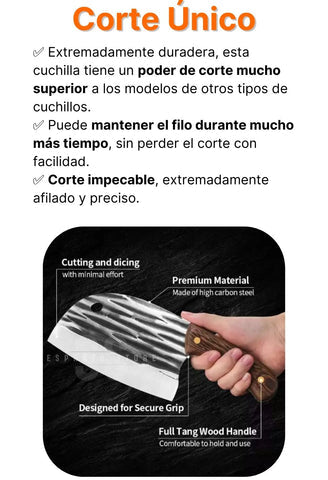 Este cuchillo está fabricado con acero inoxidable de alto carbono de calidad premium, lo que lo hace resistente al desgaste, a la corrosión y con una durabilidad superior. Su hoja mantiene el filo por mucho más tiempo, eliminando la frustración de tener que afilarlo constantemente, incluso con el uso diario y tareas exigentes.