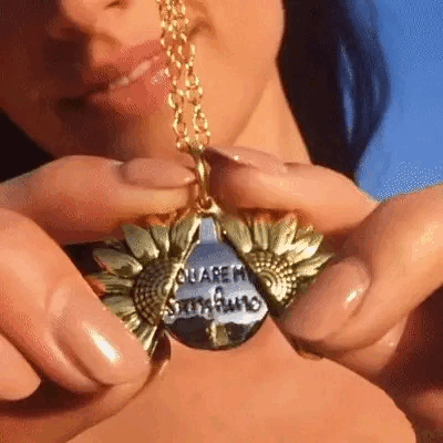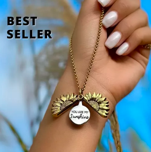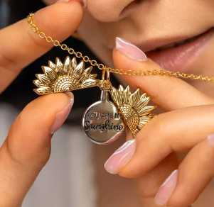 Un colgante de girasol que se abre para revelar el mensaje oculto "You Are My Sunshine".