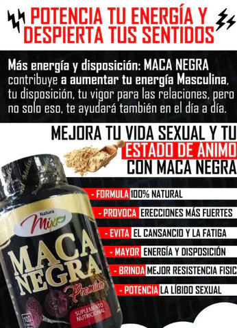 ¿Sientes que la rutina afecta tu vida íntima? La maca negra premium es la respuesta. Su fórmula enriquecida ayuda a reducir el estrés, incrementar tu libido y mejorar tu rendimiento. Siente la diferencia en tu bienestar físico y emocional desde las primeras semanas.