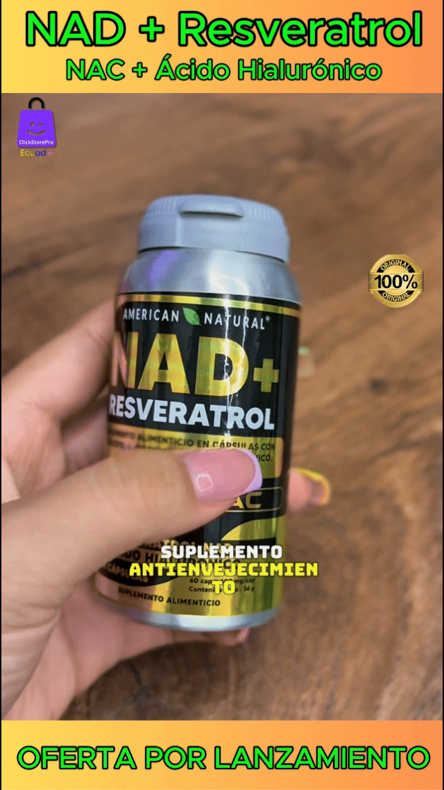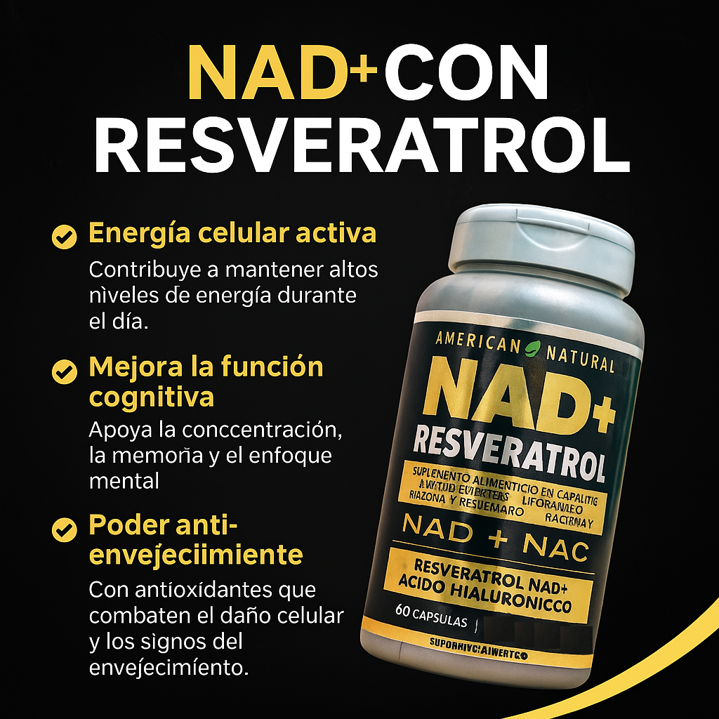 Resveratrol + NAD+ NAC de American Natural es un suplemento antioxidante avanzado, formulado con Resveratrol, NAD+ y N-Acetilcisteína (NAC), ingredientes clave para promover la longevidad celular, mejorar la función mitocondrial y fortalecer el sistema inmunológico. Su potente combinación ayuda a combatir el estrés oxidativo, apoyar la salud cardiovascular y mejorar la producción de energía a nivel celular.
