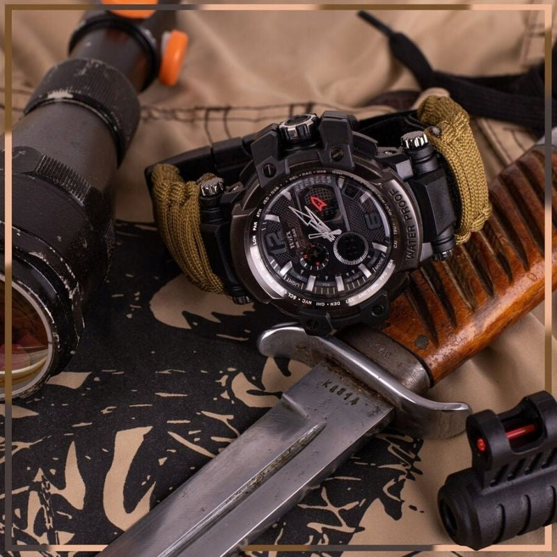 Fabricado con materiales de alta calidad como acero inoxidable, plástico reforzado y cuerda de paracord de 7 hebras, este reloj está diseñado para soportar el desgaste diario y condiciones exigentes. Perfecto para usuarios que buscan un producto confiable tanto para actividades al aire libre como para el día a día.